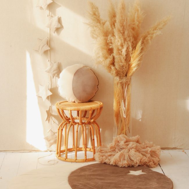 Die gesamte Einrichtung ist in hellen, neutralen Farben gehalten, die Entspannung und Ruhe fördern. Natürliche Materialien wie Holz und der geflochtene Teppich bringen ein Element der Natur in den Raum, was ein unverzichtbarer Bestandteil des skandinavischen Stils ist. Accessoires wie die Girlande mit Sternen und der weiche Pouf schaffen eine gemütliche und funktionale Umgebung, in der das Kind sowohl entspannen als auch seine Fantasie entwickeln kann. Diese Einrichtung ist ein perfektes Beispiel für die harmonische Verbindung von Ästhetik, Funktionalität und kindlicher Freude.