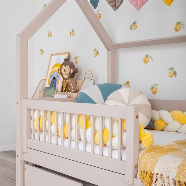 Die Einrichtung, die auf dem Bild zu sehen ist, ist ein perfektes Beispiel für die Kombination von Funktionalität und Ästhetik, die sich ideal in den modernen Stil der Kinderzimmergestaltung einfügt. Der zentrale Punkt dieses Raumes ist ein hölzernes Hausbett, das sofort mit seiner einzigartigen Konstruktion ins Auge fällt. Offensichtlich vom skandinavischen Stil inspiriert, bringt das aus Naturholz gefertigte Bett Wärme, Harmonie und Gemütlichkeit in den Raum. Die hochwertigen Materialien machen das Möbelstück nicht nur ästhetisch, sondern auch funktional, und sein minimalistisches Design passt hervorragend zu aktuellen Einrichtungstrends.